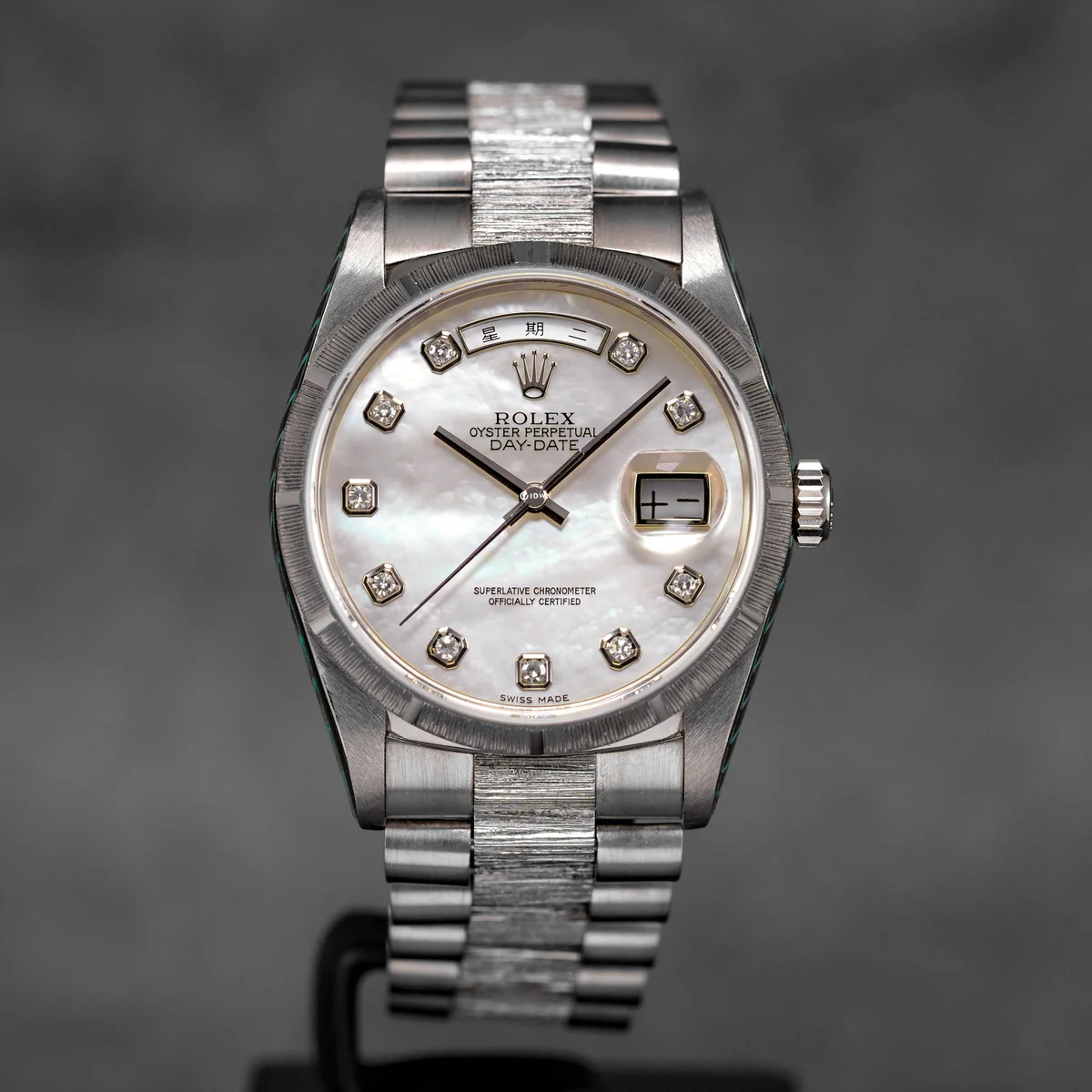 Day-Date 36mm Japanese White Gold Bark Finish MOP Diamond Dial