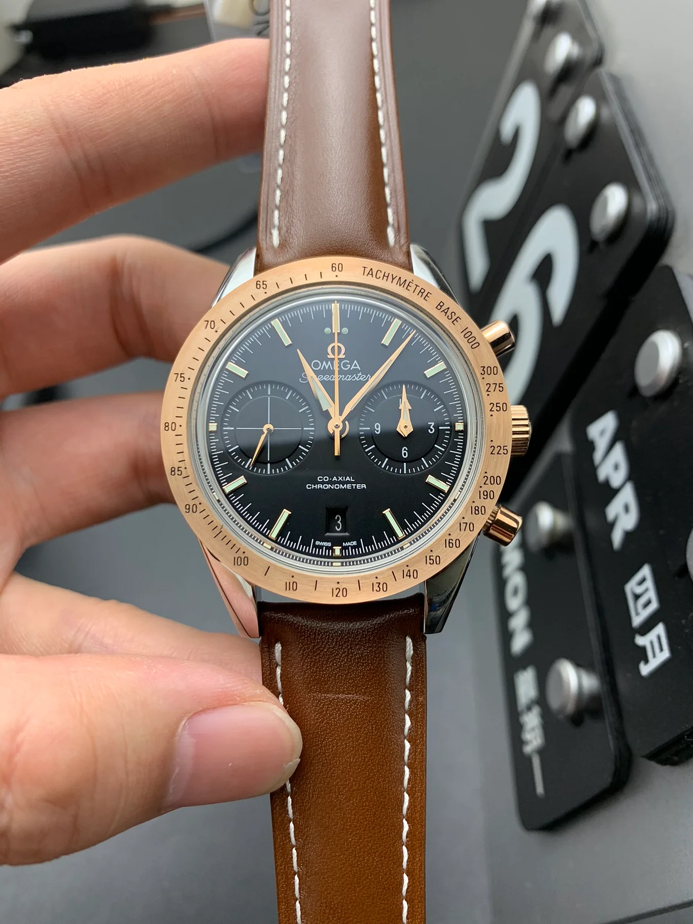 OMEGA Speedmaster ’57: The OMEGA Speedmaster ’57 41.5mm features a luxurious blend of stainless steel and 18K red gold, combined with a sun-brushed black dial and brown leather strap. Powered by the Co-Axial Master Chronometer Caliber 9900, this chronograph offers both superior performance and timeless style, making it a perfect choice for watch enthusiasts.