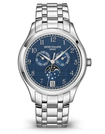 PATEK PHILIPPE 4947/1A – COMPLICATIONS offers its famous Annual Calendar in a 38 mm-diameter steel case to suit all wrists, paired with an integrated five-row bracelet. The shimmer of polished steel blends with an elegant midnight blue dial enhanced by vertical and horizontal satin-brushing. The day/date/month calendar requires only one manual correction per year.