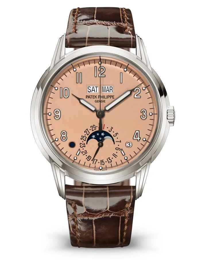 PATEK PHILIPPE 5320G – GRAND COMPLICATIONS is the epitome of balance and legibility, this perpetual calendar pairs a white gold case with three-tier lugs and a rose-gilt opaline dial. The displays feature one of Patek Philippe’s signature perpetual calendar layouts, with an in-line double day/month aperture at 12 o’clock and a date displayed by hand surrounding the moon-phase aperture at 6 o’clock.