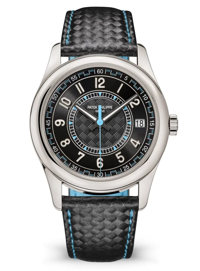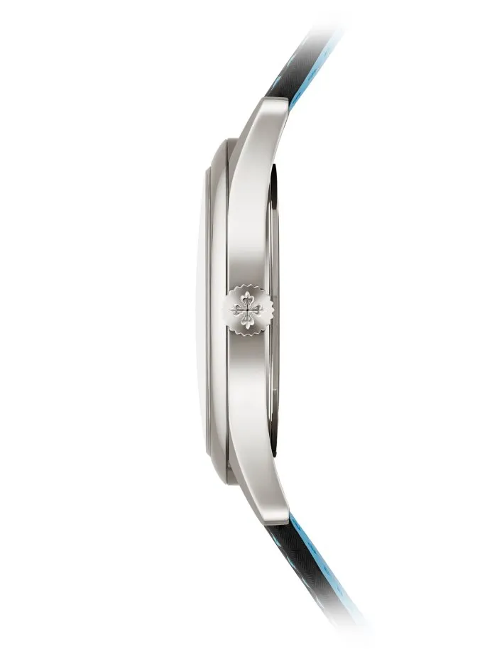 Dynamic Elegance: The Patek Philippe 6007G Calatrava Super Clone showcases a modern blue dial with a carbon-style embossed pattern, luminous numerals, and hands. Its sleek white gold case and matching strap embody contemporary sophistication and timeless appeal.