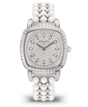 Patek Philippe 7042/100G Gondolo Featuring an Art Deco-style “cushion” case, this white gold Gondolo Haute Joaillerie combines diamonds in a variety of cuts (brilliant, baguette, trapeze, princess) with perfectly rounded Akoya pearls to create a highly refined setting. Beating inside is a mechanical manually wound movement visible through the sapphire case-back.