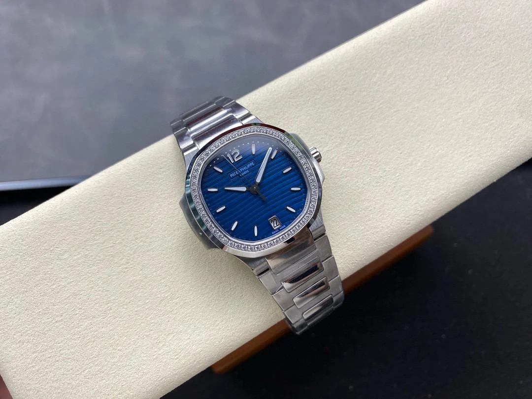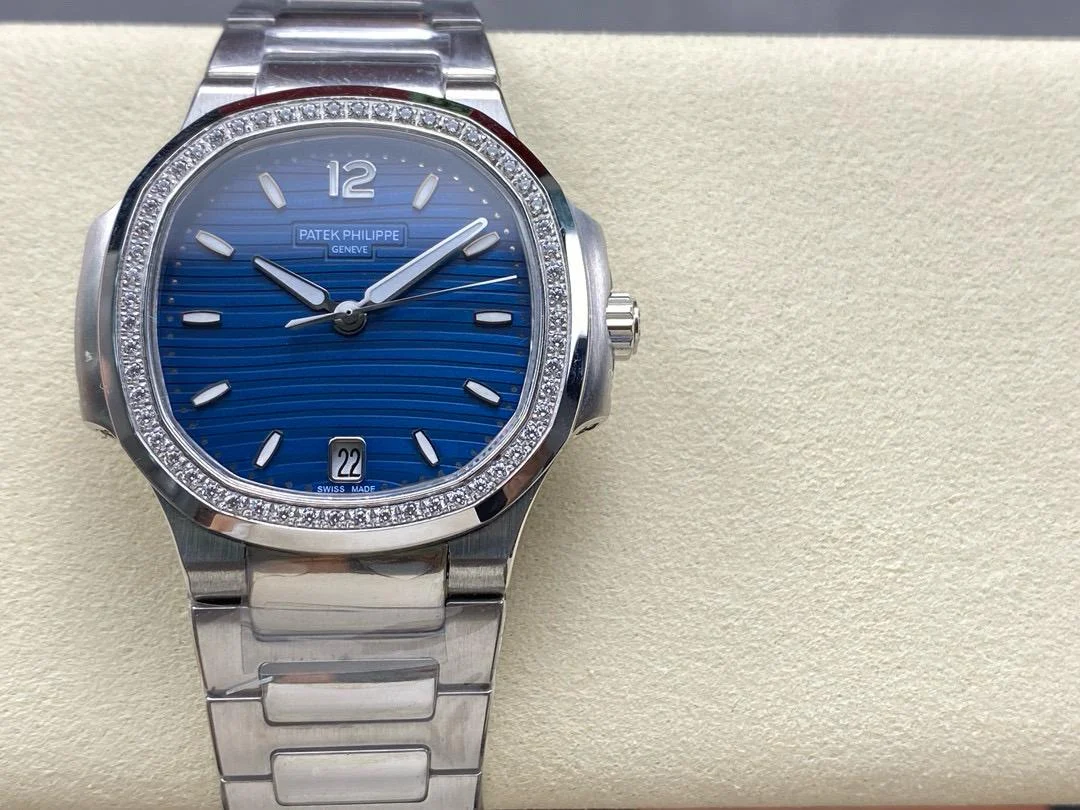 Elegance Redefined: Impeccably crafted, the Patek Philippe Nautilus clone takes the iconic style of the original and elevates it with a stunning blue diamond bezel. The traditionally sporty Nautilus line explores a more genteel aesthetic with the addition of refined, feminine details, making it a perfect choice for the discerning woman.