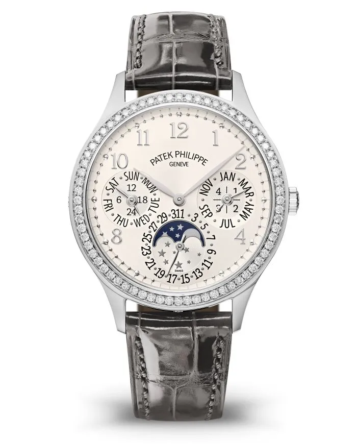 Patek Philippe 7140G – Grand Complications pays tribute to women’s increased interest in beautiful, complicated watches with a perpetual calendar associating technical refinement with aesthetic appeal. The famous ultra-thin self-winding Caliber 240 Q is housed in an elegant white gold case with diamond-set bezel. The silvery sunburst dial is adorned with applied numerals and minutes ‘pearls’ in white gold