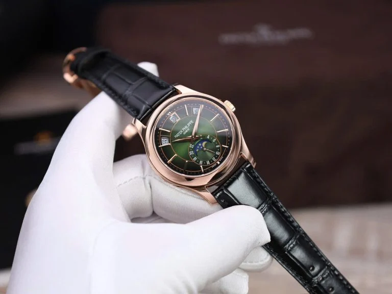 Patek Philippe Complications 5205R Green Dial Gold Wrapped 40mm rose gold timepiece is distinguished by an olive green dial, enlivened by a sunburst pattern and a black-gradient rim, as well as by its case with scalloped flanks and openworked lugs. The automatic movement features the ingenious, patented Patek Philippe Annual Calendar mechanism, which requires only one manual correction per year, at the end of February