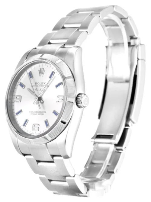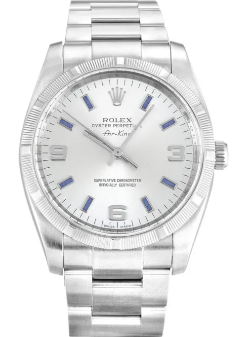 Sophisticated and Timeless: The Rolex Air-King 34mm Silver Dial 114210-2 combines refined elegance with robust performance. Its classic silver dial is complemented by an engine-turned bezel, offering a unique and sophisticated look. This timepiece embodies the heritage and precision of Rolex, making it a distinguished choice for enthusiasts of timeless design.