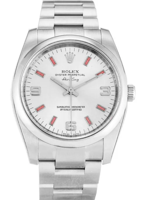 Classic Elegance: The Rolex Air-King 34mm White Dial 114200-2 presents a harmonious blend of timeless design and reliable functionality. Its clean white dial, accented by luminous Arabic numerals and indexes, enhances its sophisticated appearance. Crafted with Rolex’s enduring craftsmanship, this model is ideal for those seeking a watch with both classic appeal and modern precision.