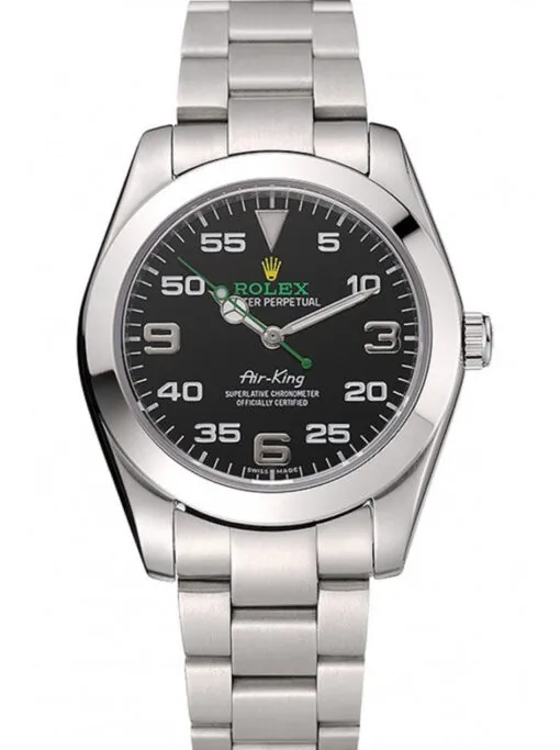 Rolex Air-King 38mm Black Dial 1454020 Super Clone immediately recognizable with its large 3, 6 and 9 hour markers, combined with a prominent minutes scale, the Oyster Perpetual Air-King embodies the ties Rolex has forged with the world of aviation since the 1930s. Robust and precise, the watch pays tribute to the daring pioneers of airborne adventure. Its unique face recalls a shared history marked by records and achievements. Through this aeronautical inspiration, the Air-King encourages each of us to release our adventurous spirit and reach for the sky.