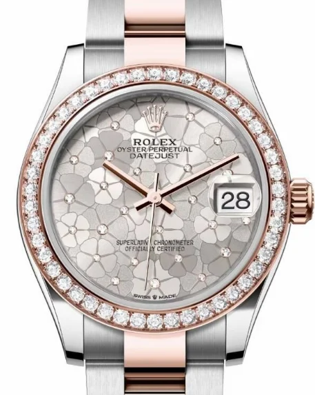 Rolex Everose Rolesor Datejust 31 Watch – Diamond Bezel – Silver Floral Motif Diamond Dial – Oyster Bracelet – Super Clone